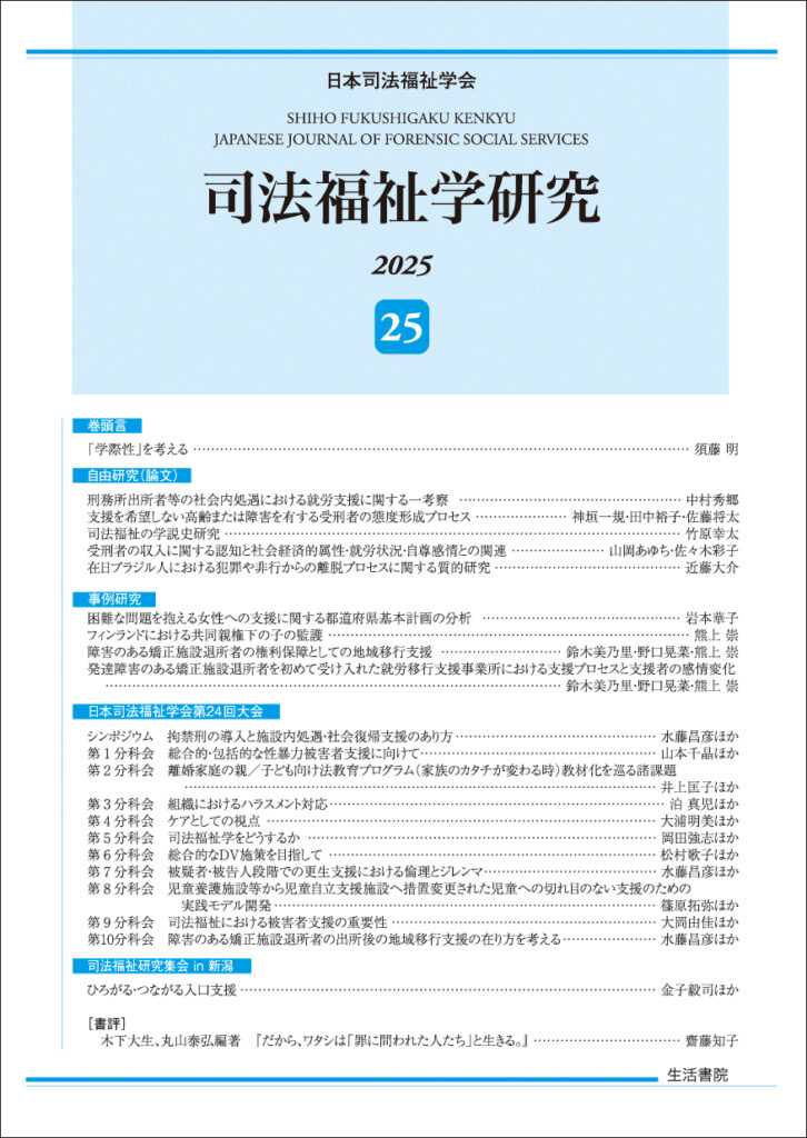 [日本司法福祉学会] 2000年11月結成。規約において、会の目的を「司法における規範的並びに実体的問題解決の福祉的側面に着目し、問題の適正で妥当な解決を実現することを目指して、これに関連する分野の学術的研究や実務に携わる者が共同して研究を推進し、もって社会に貢献すること」と定めている。